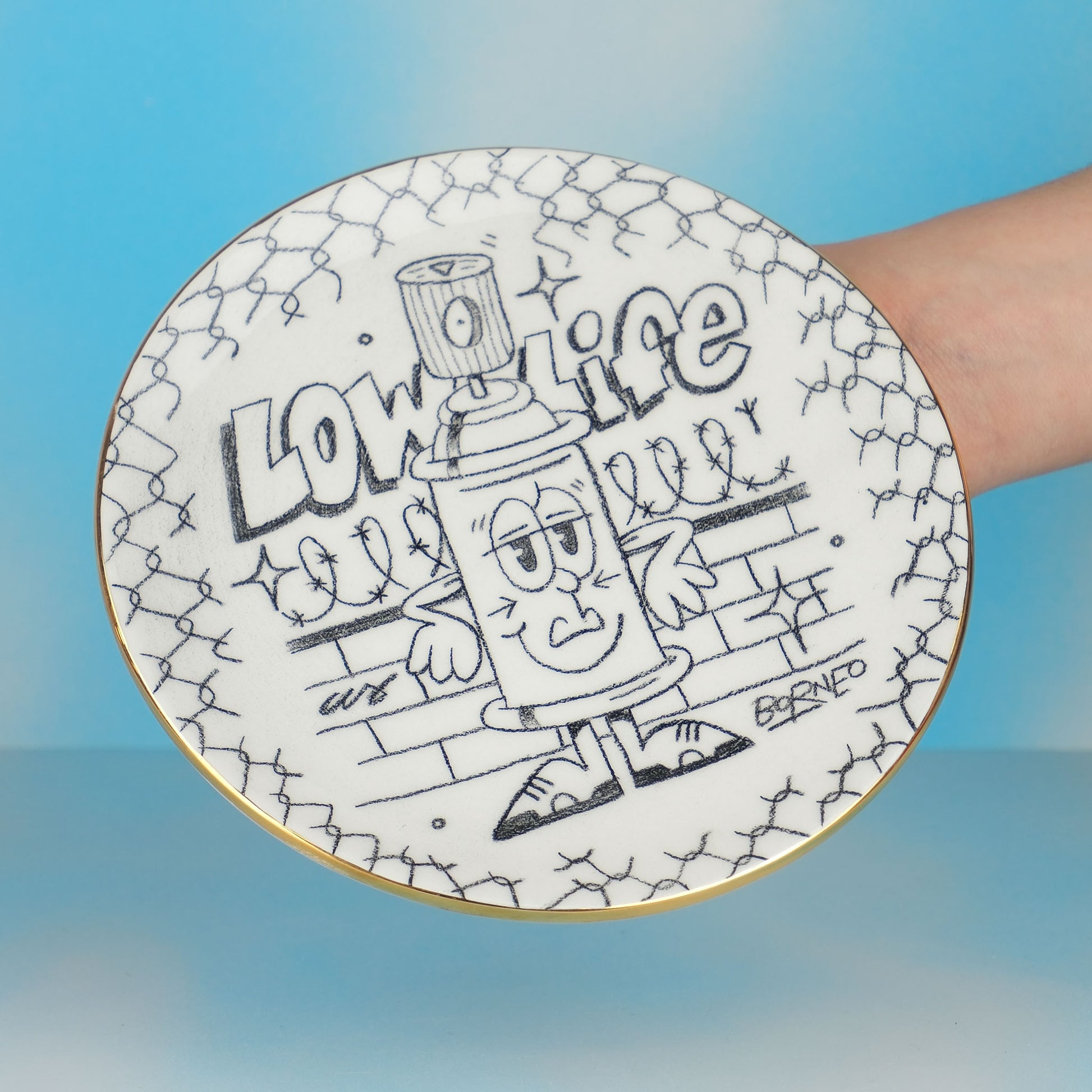 Earthenware plate featuring an original illustration by Borneo, showcasing a spray can character. Each piece is uniquely painted and finished with an elegant gold lustered rim, making it a striking decorative accent or functional art piece. Perfect for collectors of contemporary ceramics and street art enthusiasts.